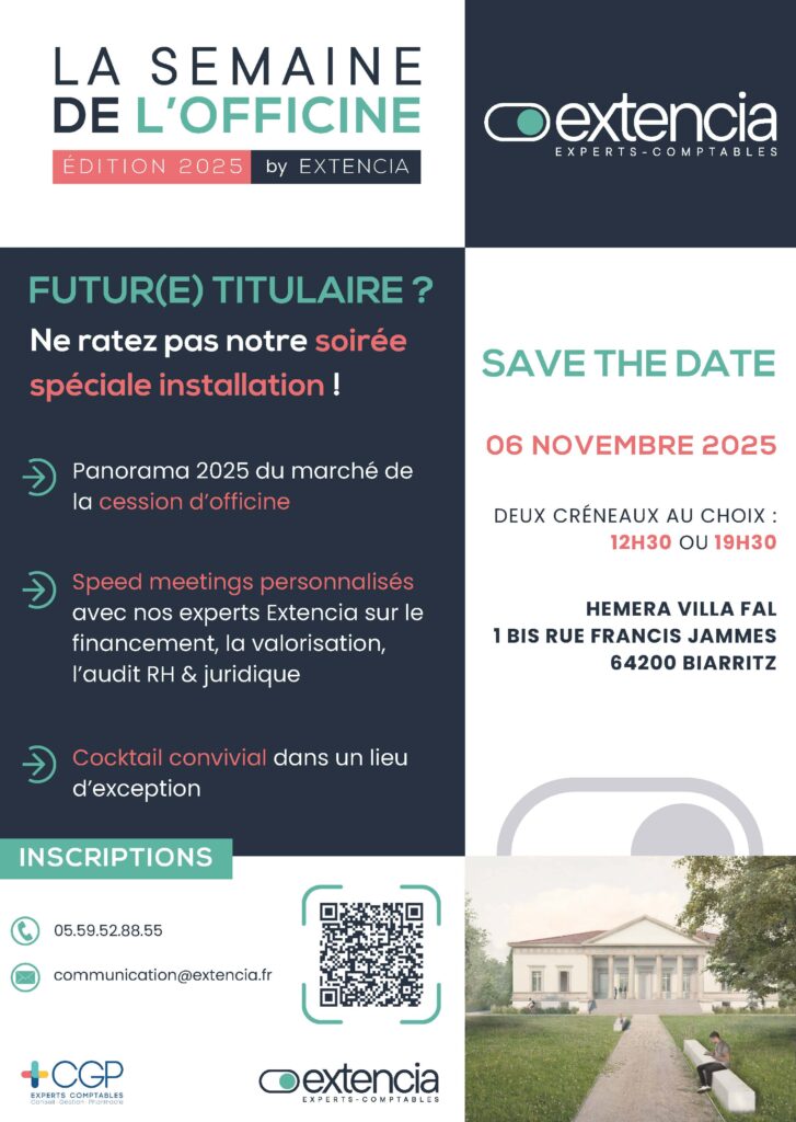 Dans le cadre de la Semaine de l’Officine 2025, Extencia vous propose un Ă©vĂ©nement dĂ©diĂ© aux pharmaciens porteurs de projets ou en rĂ©flexion sur une installation. Nos spĂ©cialistes du secteur partageront avec vous conseils pratiques et retours d’expĂ©rience pour sĂ©curiser chaque Ă©tape de votre parcours lors d’un Speed Meeting Ă la Villa Fal, lieu emblĂ©matique de Biarritz.